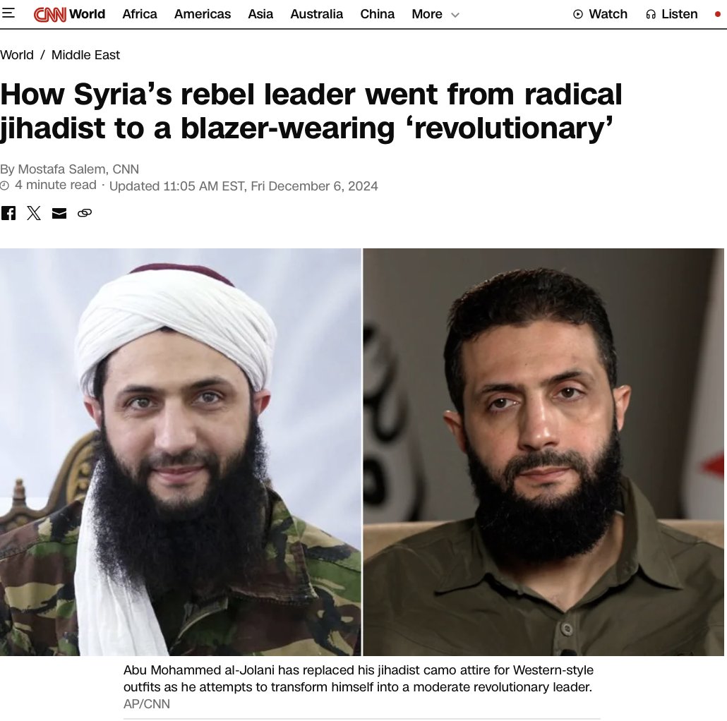 ignatius Posted December 10, 2024 Report Share Posted December 10, 2024 On 12/10/2024 at 1:52 AM, decibal cooper said: kind of wild that the US tried unsuccessfully to do regime change on Assad for years and then it happens in a 10 day period at the very end biden's presidential term. Israel has already seized land in Syria on their border, creating a 'temporary buffer zone.' I have been following news stories and it looks like the rebels did not even have to do any significant fighting to take those cities. This most likely means that the official Syrian army, the one backing Assad, just stood down. I wonder if there were talks leading up to this between the central players (Russia, Turkey, Israel, US). This absolutely a tactical victory for Israel and America, as it cuts off Iranian support to palestine via Lebanon through Syria. Russia has two military bases in Syria, wonder what will happen to those. It sucks that regular Syrian citizens seem to have to pay the price for all of these power games that are out of their control. The current defacto leader of Syria is Jolani, who was an ISIS soldier for 6 years. He leads an organization, HTS, that is an offshoot of al qaeda, the group that attacked America on 9/11. America has a 10 million bounty on this man: He apparently has changed his ways since 2017, though, and his days of hardhitting islamist terrorist activity is over. I just hope he is the man to bring democracy to Syria finally and also a pluralistic, multicultural society. Judging from Western coverage of the story, I think this is likely: CNN did an interview with him during the offensive: I am so glad that they clarified what his pronouns are. That's neat! Maybe we can finally get the islamist institutions we have all been waiting for, the ones that put a premium on lgbtq+ rights and inclusion. Not only is he progressive politically, but he is no stranger to the arts and is in fact an avant garde filmmaker (so cool!). He did a bunch of documentaries about beheading infidels. I have not seen them yet but I hear good things! Joking aside I hope that this somehow pans out in a positive direction for Syrians, but I am definitely skeptical. As bad as Assad was, there is a good chance that these guys will either be worse or that they will eventually be the ones attacking America and other western countries directly (and Europe is closer than America to them). It has happened before: Expand Thanks Haha Confused Sad Facepalm Burger Farnsworth Big Brain Like × Quote Hide ignatius's signature Hide all signatures Releases Sample LIbraries instagram Cascade Data Mastodon Reveal hidden contents "All I know about you is what a knock off Autechre lite artist you are, how many you put out?> same with your fucking mindset, vanilla...........goodnight." - arti Link to comment https://forum.watmm.com/topic/79352-syrias-assad-used-chemical-weapons-on-his-own-people/page/16/#findComment-2997058 Share on other sites More sharing options...