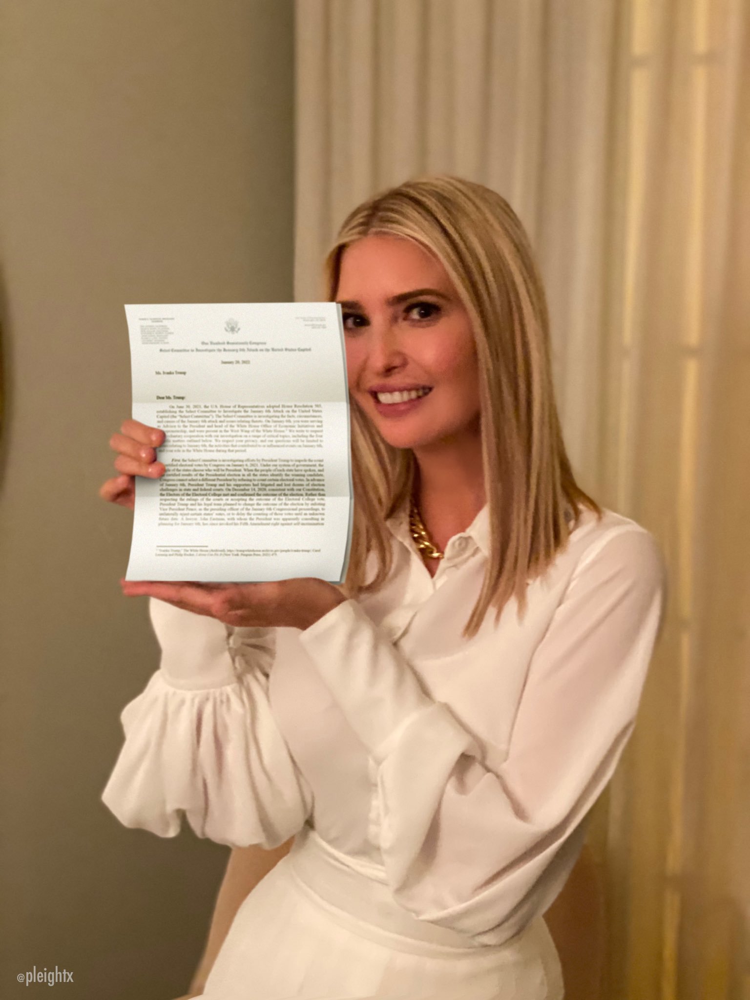 Nebraska Posted January 21, 2022 Report Share Posted January 21, 2022 Quote "Ivanka Trump just learned that the January 6 Committee issued a public letter asking her to appear," a spokesperson for Ivanka Trump said in a statement. "As the Committee already knows, Ivanka did not speak at the January 6 rally. As she publicly stated that day at 3:15 p.m., "any security breach or disrespect to our law enforcement is unacceptable. The violence must stop immediately. Please be peaceful.'" https://www.reuters.com/world/us/jan-6-panel-plans-seek-testimony-ivanka-trump-cnn-2022-01-20/ Thanks Haha Confused Sad Facepalm Burger Farnsworth Big Brain Like × Link to comment https://forum.watmm.com/topic/97420-2020-us-election/page/207/#findComment-2903509 Share on other sites More sharing options...